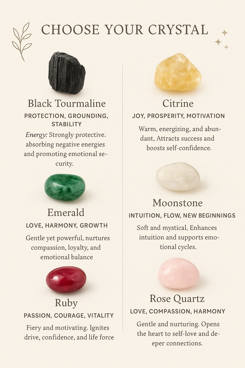 Rose Quartz - Love, Compassion, Harmony. Energy: Gentle and nurturing. Opens the heart to self-love and deeper connections.